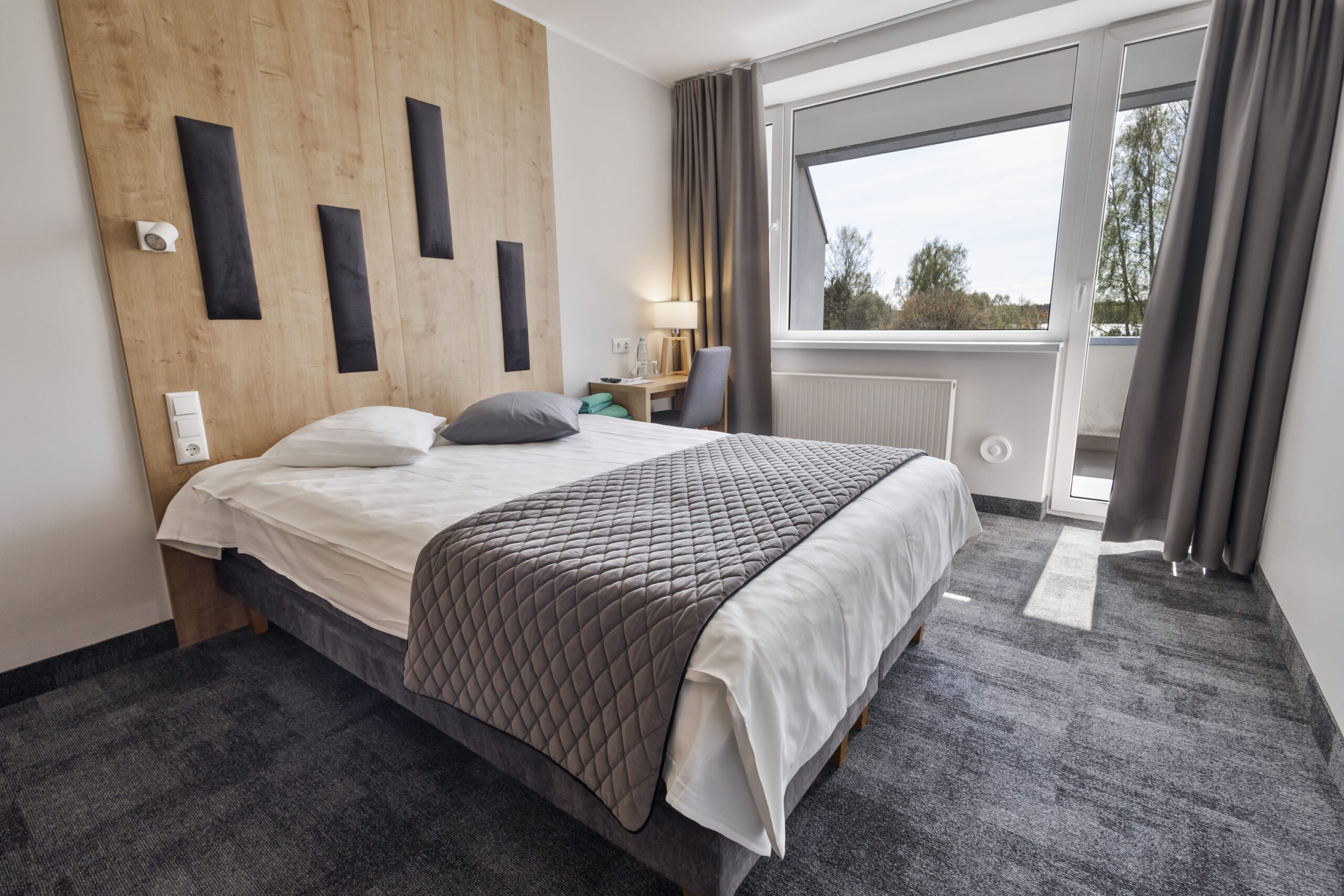 В номере находятся стандартная кровать, платяной шкаф, письменный стол, телевизор и душевая комната с туалетом. Большинство номеров с балконом, с которого открывается живописный вид на залив Вярска.